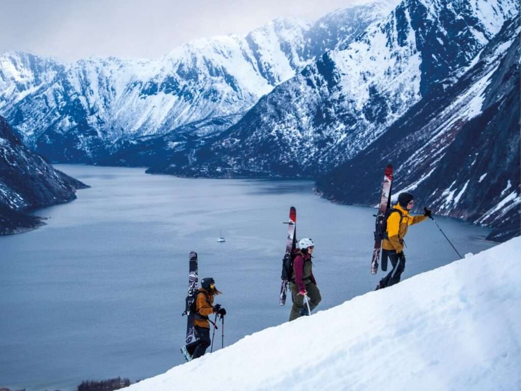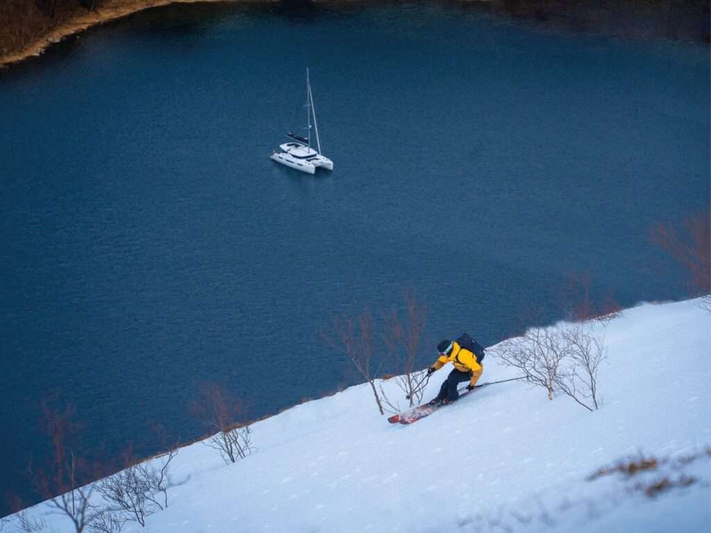 Winter transforms the landscape entirely: hike snow-dusted peaks, fish in icy fjords, or watch the Northern lights illuminate the night sky. With kayaks, a tandem SUP, and freediving and fishing gear on board, adventure is never far away.