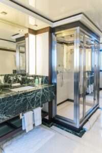 With the volume of a 50m+ yacht spread across four luxurious levels, ALALYA offers expansive spaces for both relaxation and entertainment. Guests can unwind on the extensive sundeck, complete with a Jacuzzi, bar, and panoramic sea views, or enjoy movie nights in the stylish sky lounge. The yacht’s elegant interior accommodates up to 12 guests in five beautifully appointed staterooms, plus a sixth multipurpose cabin ideal for additional staff, a nanny, or children. Every cabin is designed with comfort and privacy in mind, providing a sanctuary at sea.
