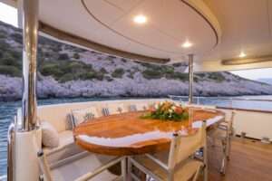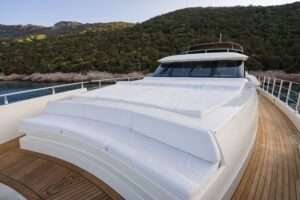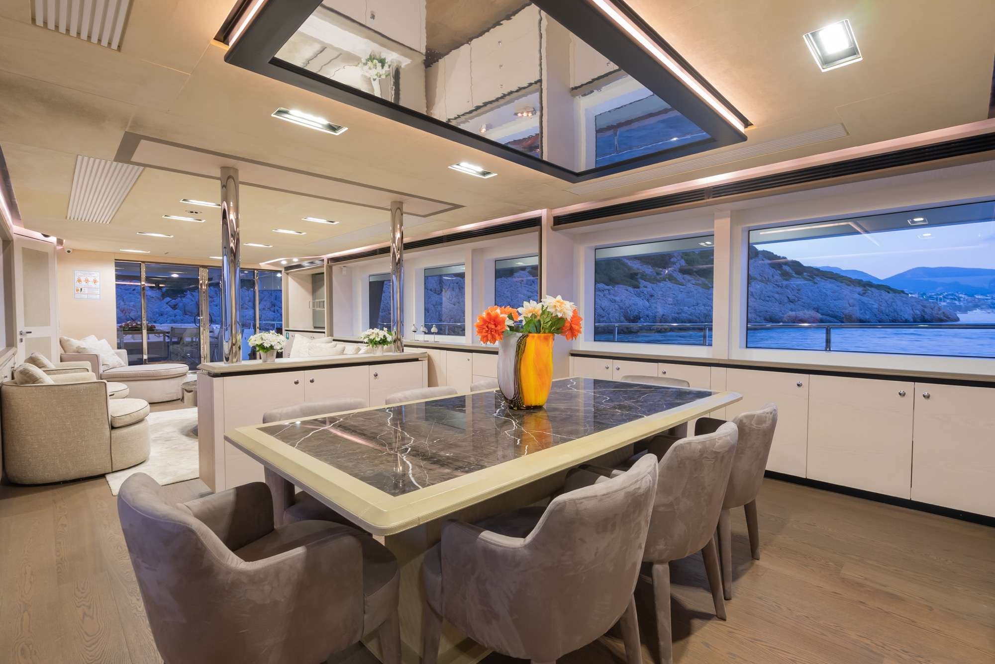 Inside, the main saloon is a bright, contemporary sanctuary. Floor-to-ceiling windows flood the interior with natural light and offer stunning views of the coastline. ARCHSEA is the perfect choice for exploring the turquoise waters of Turkey and the Greek Islands in absolute luxury and style.