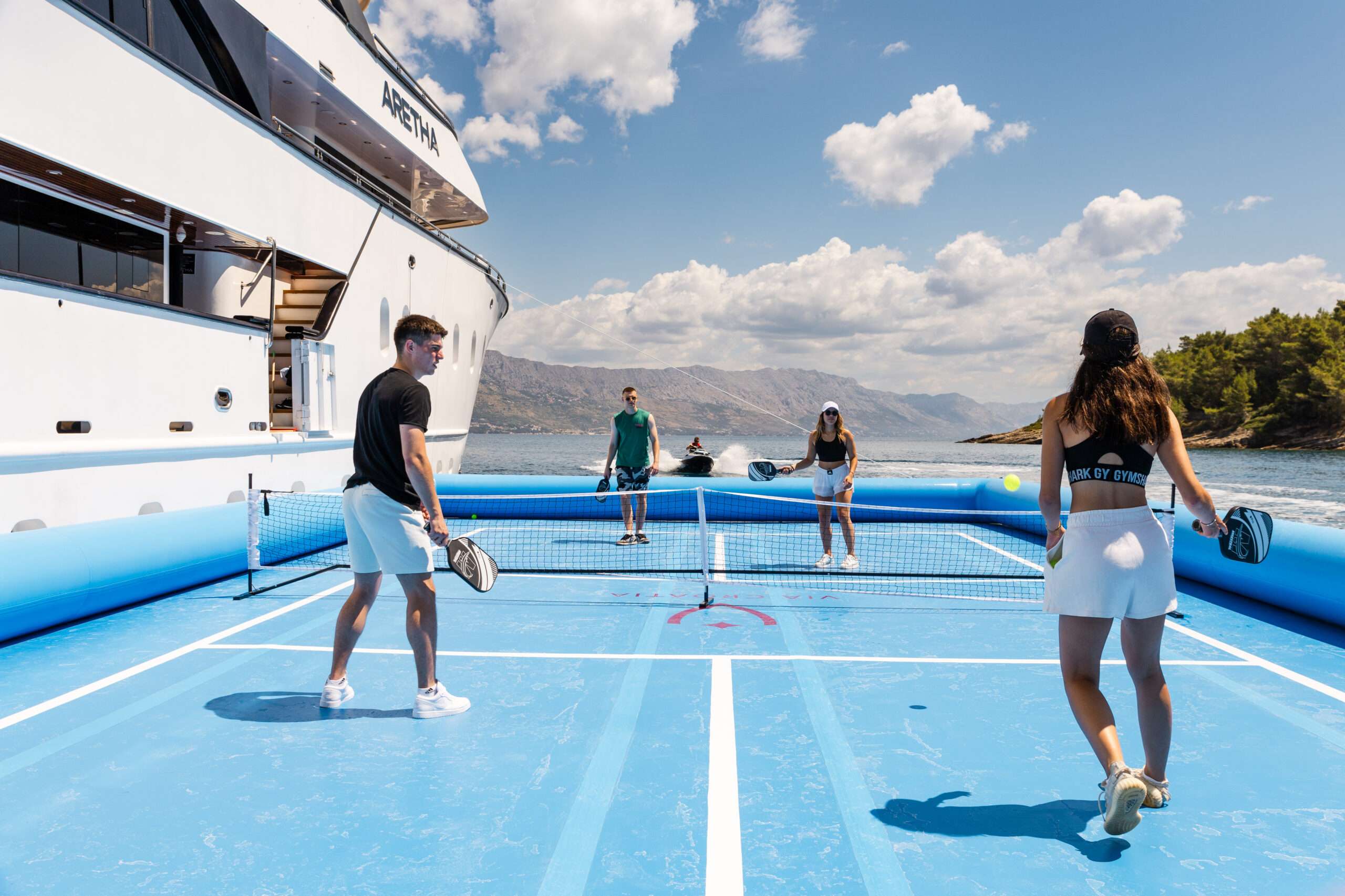 The top deck includes a spacious lounge area with a bar and two large jacuzzis, ideal for enjoying sweeping views over the Adriatic Sea. In addition, guests can make use of the indoor gym, sauna and wellness room, allowing both relaxation and activity during the charter. Consequently, those who Charter ARETHA luxury yacht in Croatia enjoy access to a complete onboard lifestyle experience.