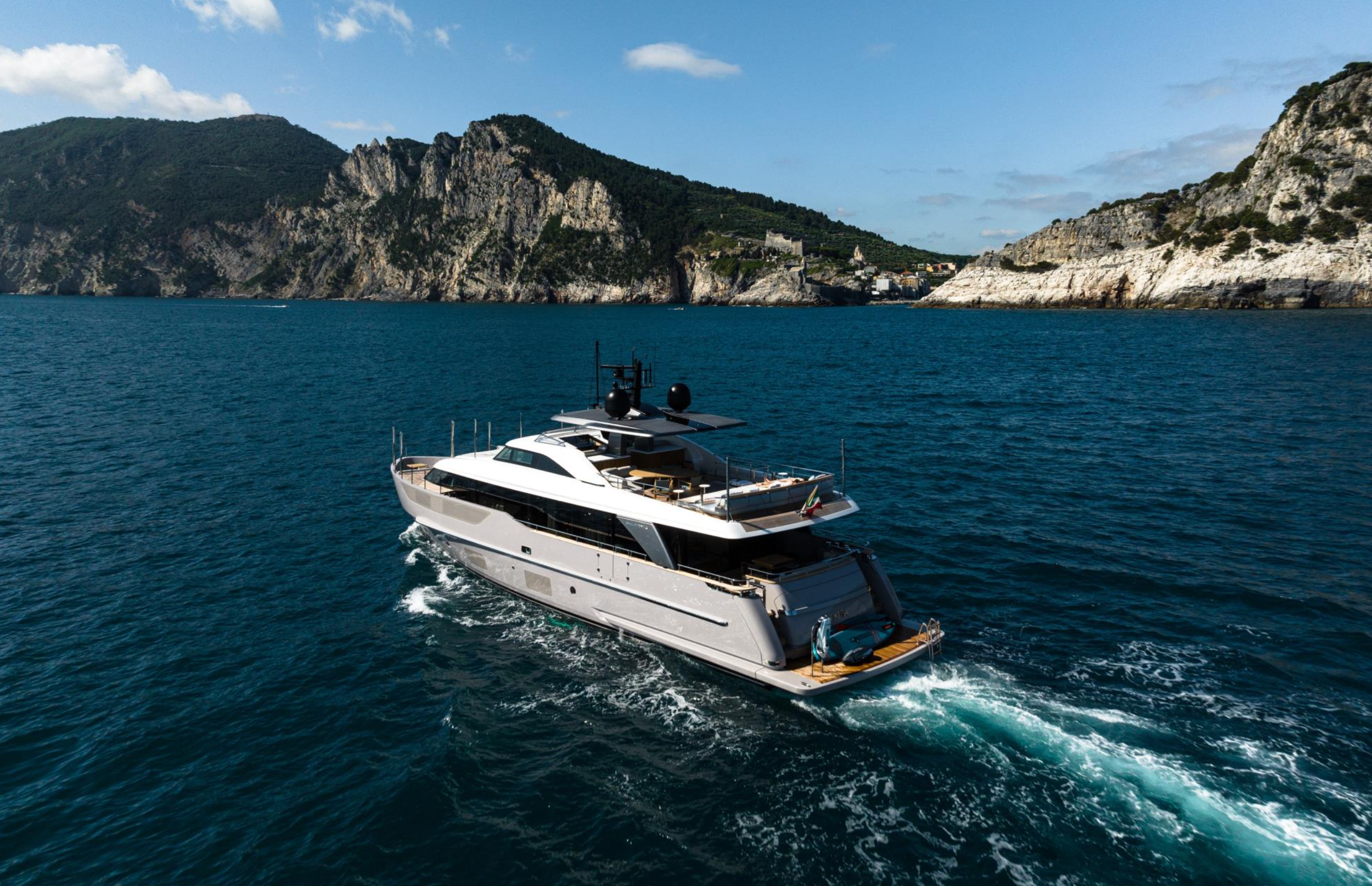 Step into the yacht’s interior, an award-winning masterpiece by Vickers Studio, earning the BOAT International Design & Innovation Award for Best Interior Design below 500 GT in 2020. Soft pale oaks, stainless steel accents, and leather detailing seamlessly blend with natural elements, creating a luxurious space exuding clean lines reminiscent of a Riviera chic beach house with the relaxed ambiance of Ibiza. The integration of textured light fabrics and contrasting cushions unifies the interior and exterior spaces.