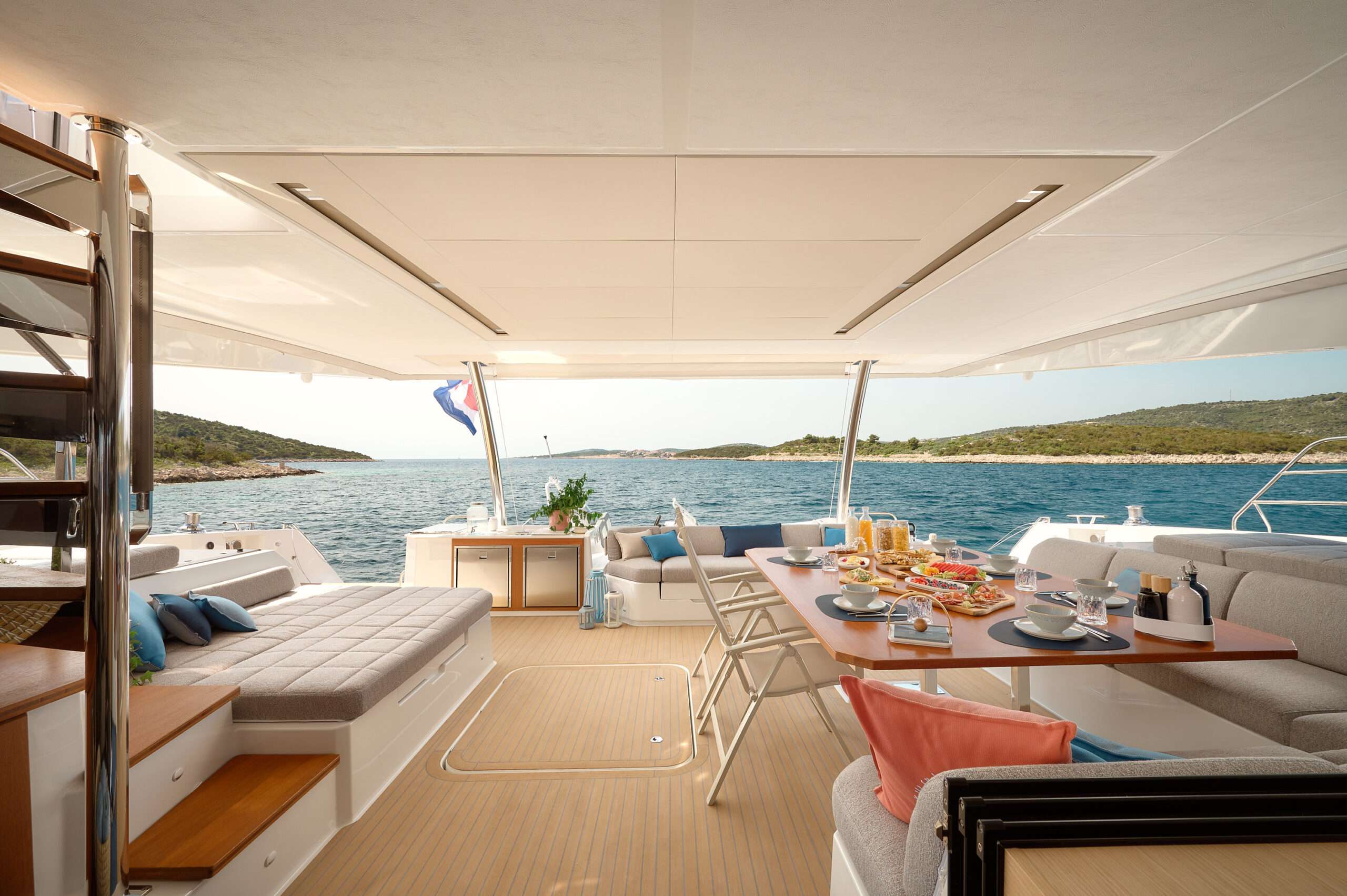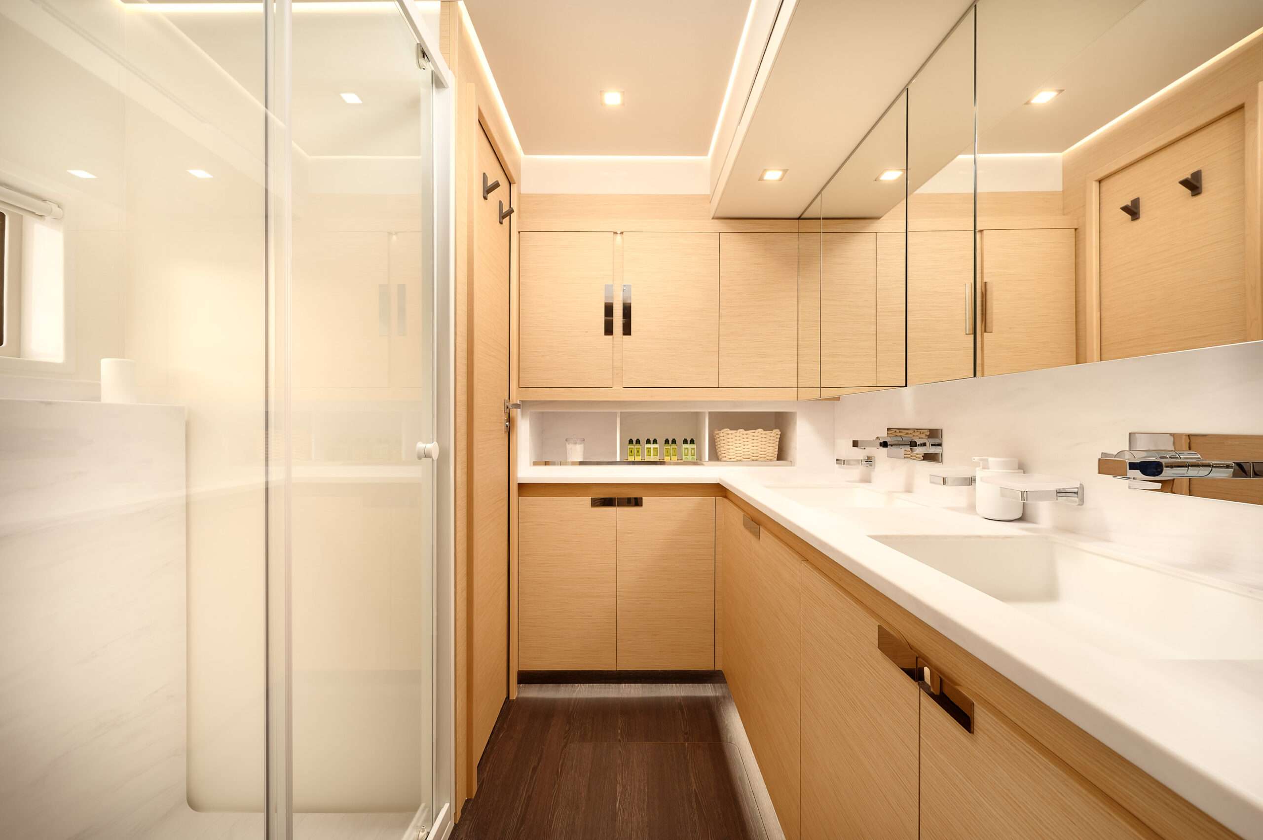 FLORAMYE has four guest cabins, including a master suite and three doubles, all with queen-sized beds and ensuite bathrooms. The spacious saloon features a galley, indoor and outdoor dining areas. Outdoors, a teak deck, jacuzzi, trampolines, and flybridge provide ample space for relaxation and enjoying the view.