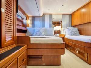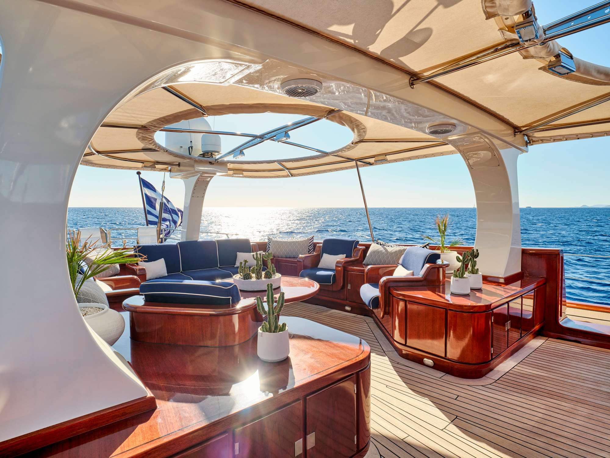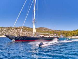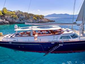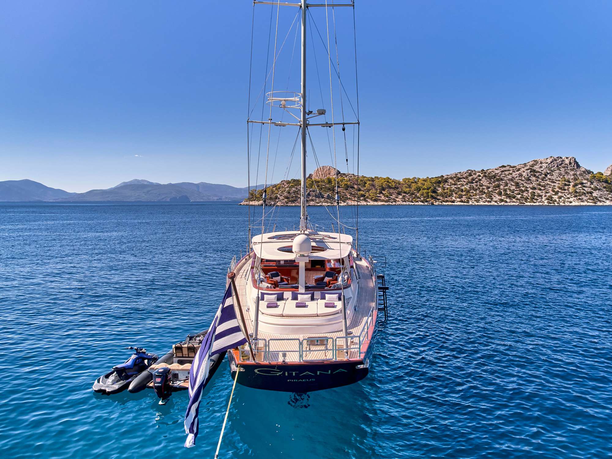 S/Y GITANA is a stunning 36m Perini Navi that masterfully combines timeless design with modern comforts. With elegant interiors by Guido de Groot and Ralph Lauren, she welcomes up to 9 guests in 3 beautifully appointed cabins. Her expansive cockpit with 360° views, wet bar, and outdoor cinema setup makes her ideal for alfresco living. Refitted in 2015 and packed with water toys and a stylish tender, GITANA offers a refined sailing experience across the Mediterranean.