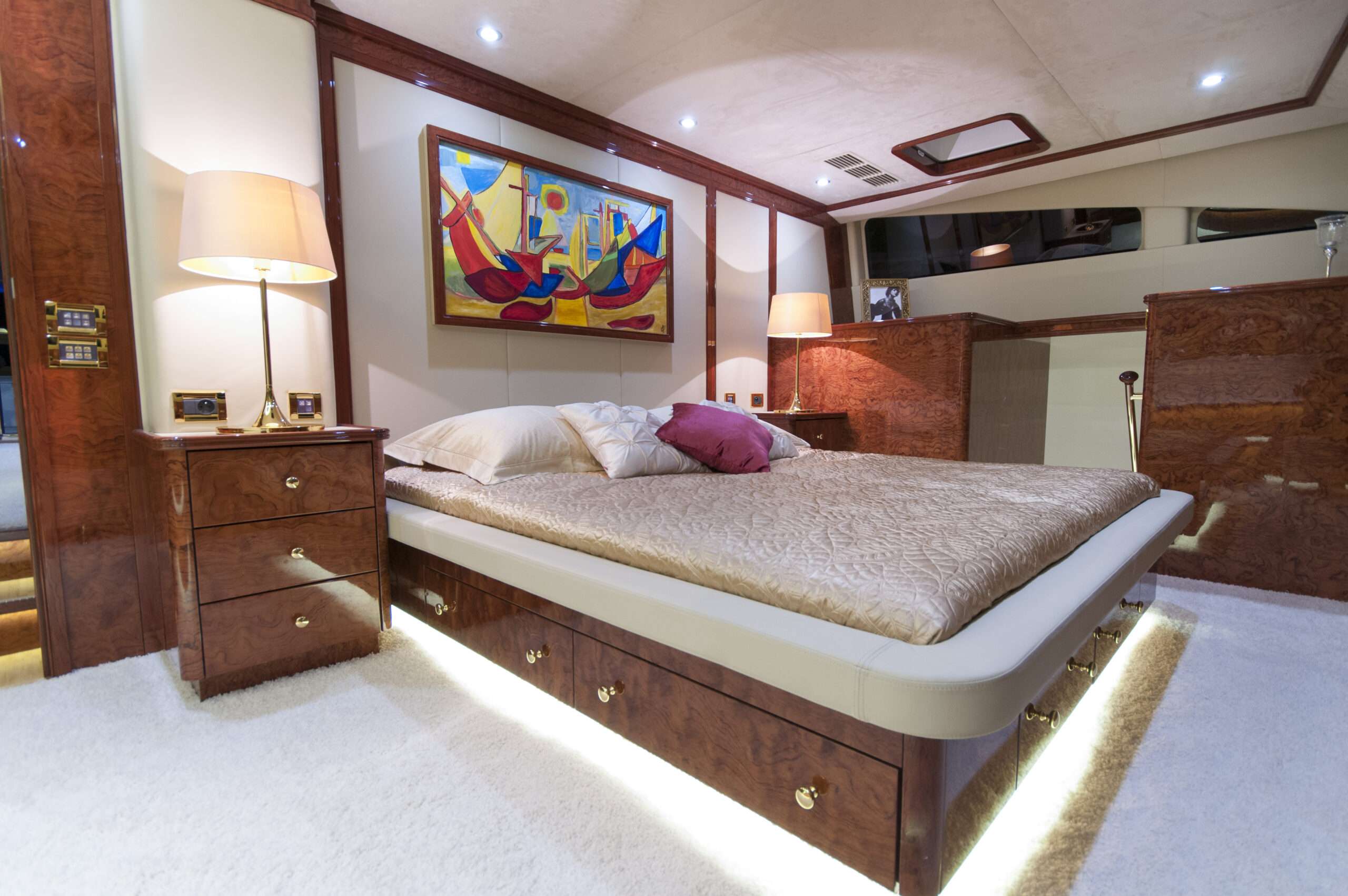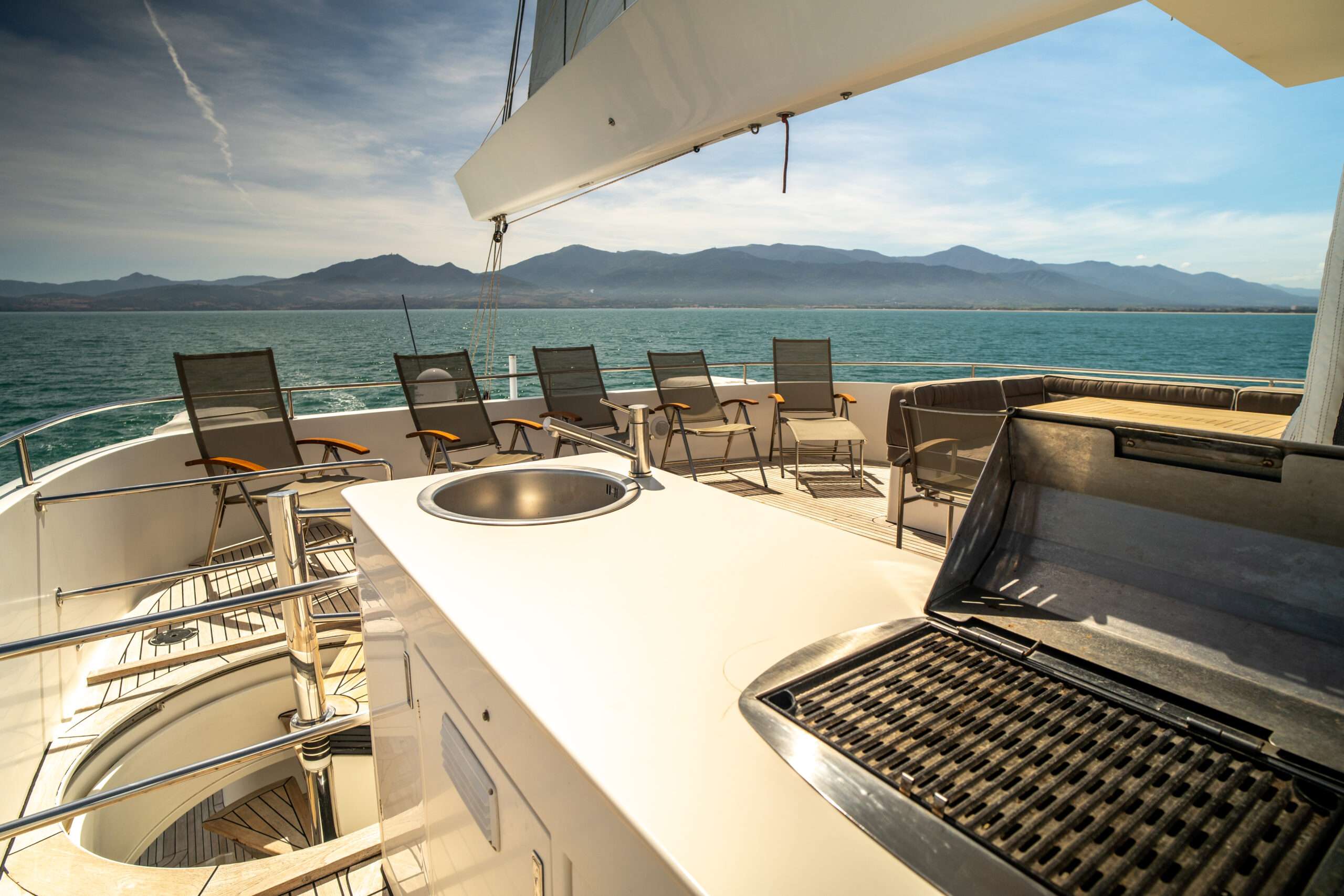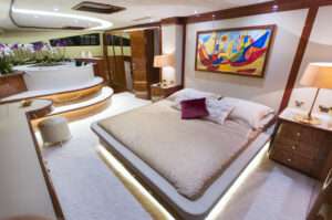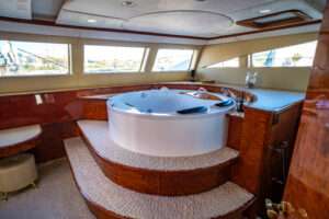 Accommodation is arranged for up to six guests in three ensuite cabins: a full-beam master suite complete with a private jacuzzi, a queen cabin, and a flexible twin that can convert to a double with an additional Pullman. Large windows throughout ensure abundant natural light and uninterrupted sea views, while ample storage and full air-conditioning enhance comfort.