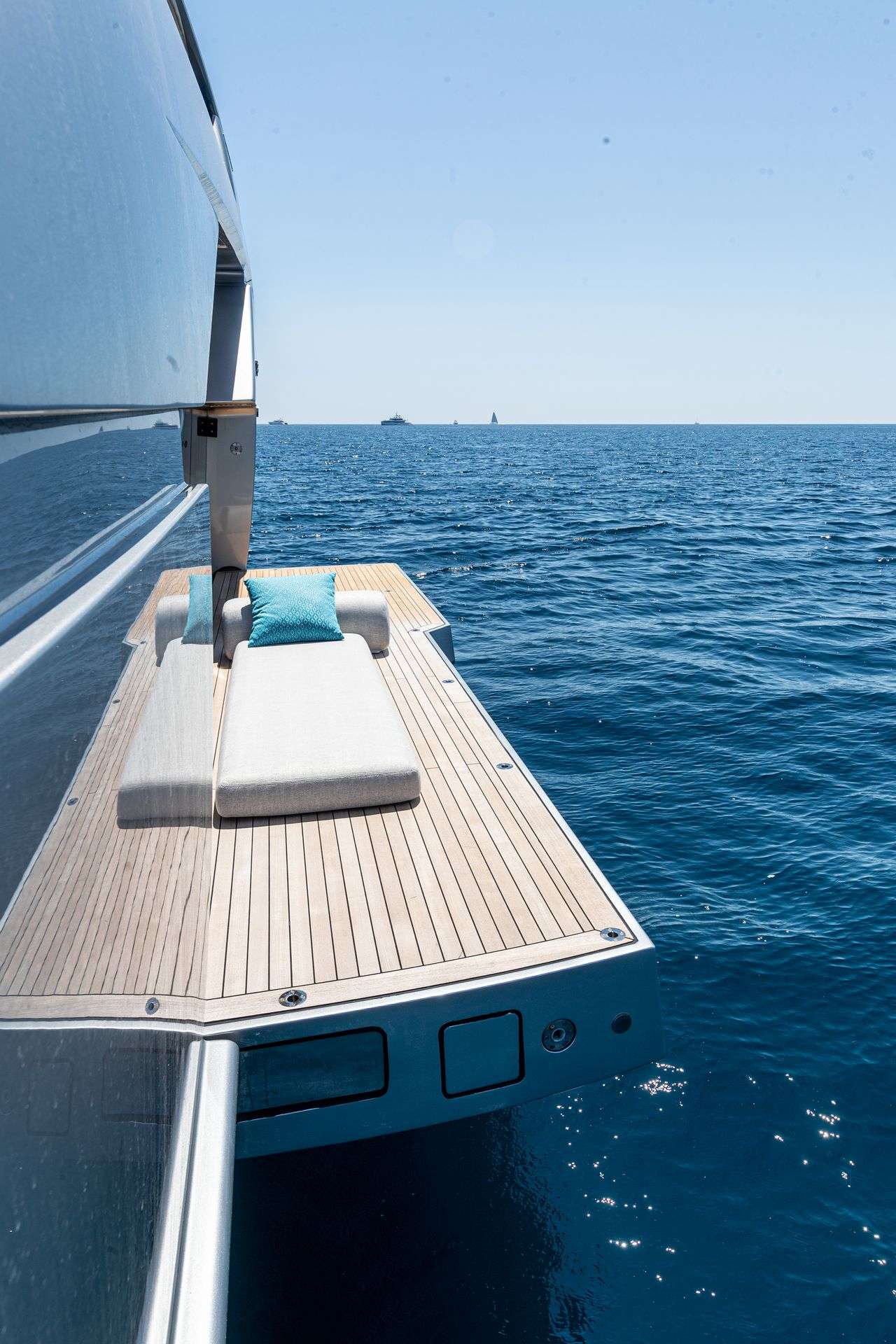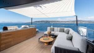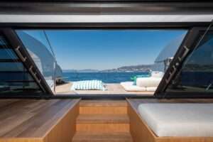 The main deck and flybridge offer seamless indoor-outdoor living, ideal for dining, lounging, or sunbathing. A standout feature is the extendable beach club aft, which opens into a spacious platform for relaxation or water activities, fully immersing guests in the surrounding seascape.