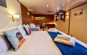 Inside, Polarfront pairs retro character with contemporary Scandinavian style. Eight well-appointed cabins host up to 12 guests, supported by a professional crew of 11, including two expert expedition guides and a French chef whose locally influenced menus turn every meal into a highlight. At the centre of the onboard experience is the Coriolis Lounge, a welcoming space for storytelling, talks, and relaxed evenings with fellow explorers.