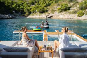 She accommodates up to 12 guests in six beautifully designed staterooms, including a private master suite occupying its own deck with a lounge, balcony jacuzzi, and terrace. The remaining guest cabins are located on the lower deck, each with en-suite bathrooms and modern comforts. Two aft cabins can be connected to create a spacious family suite for added flexibility.