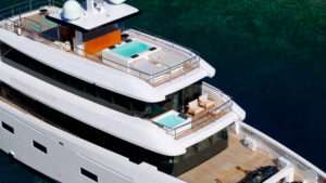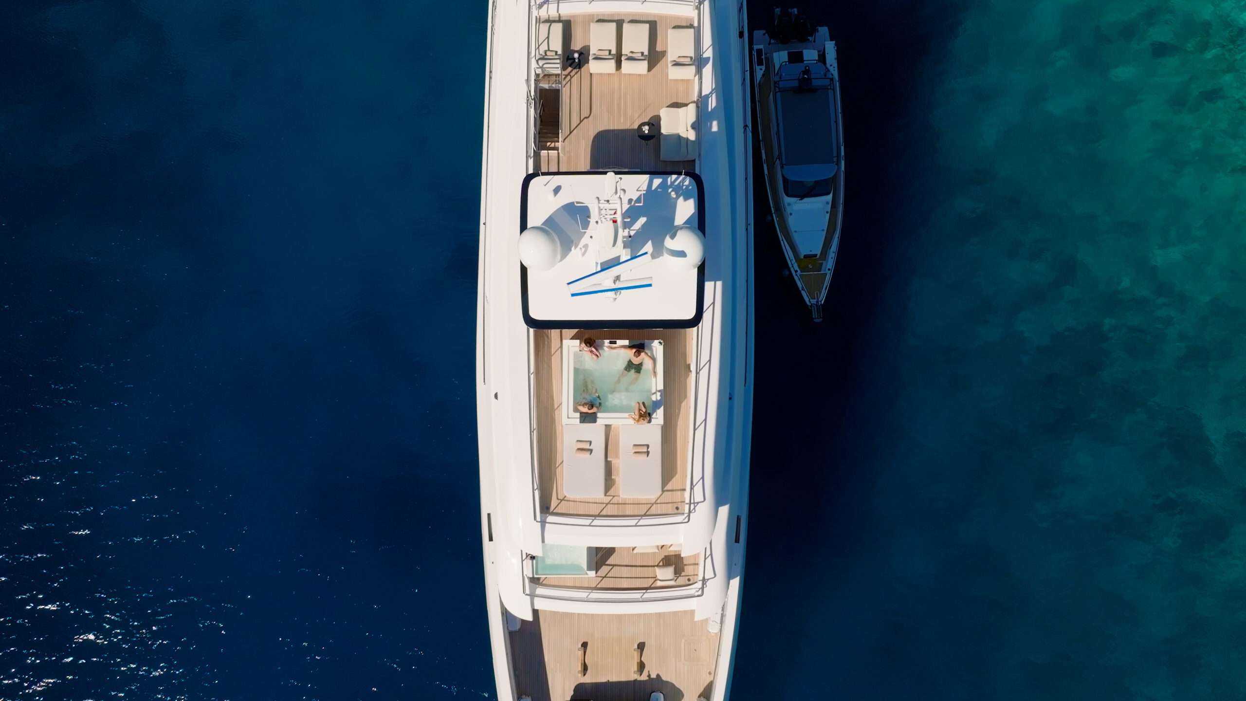 Her bright main salon features floor-to-ceiling windows and a cinema projector for relaxed evenings on board. Outdoor spaces include a sundeck with jacuzzi, bar, shaded lounge, and barbecue area, while the beach club offers a sauna and easy access to the sea.
