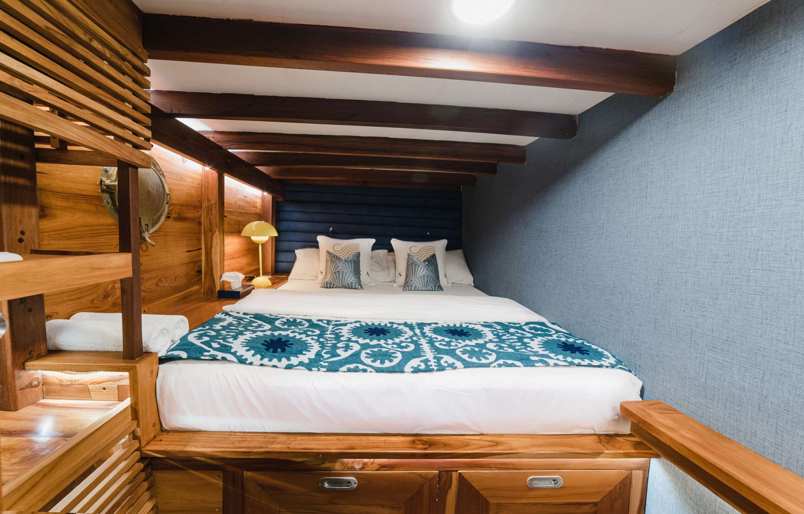 The shaded foredeck offers a seating area as well as an outdoor gathering spot. Samara II can accommodate up to 8 guests, with 4 cabins and 2 shared bathrooms with toilet and shower. It is perfect for a small family, romantic cruise and honeymoon.