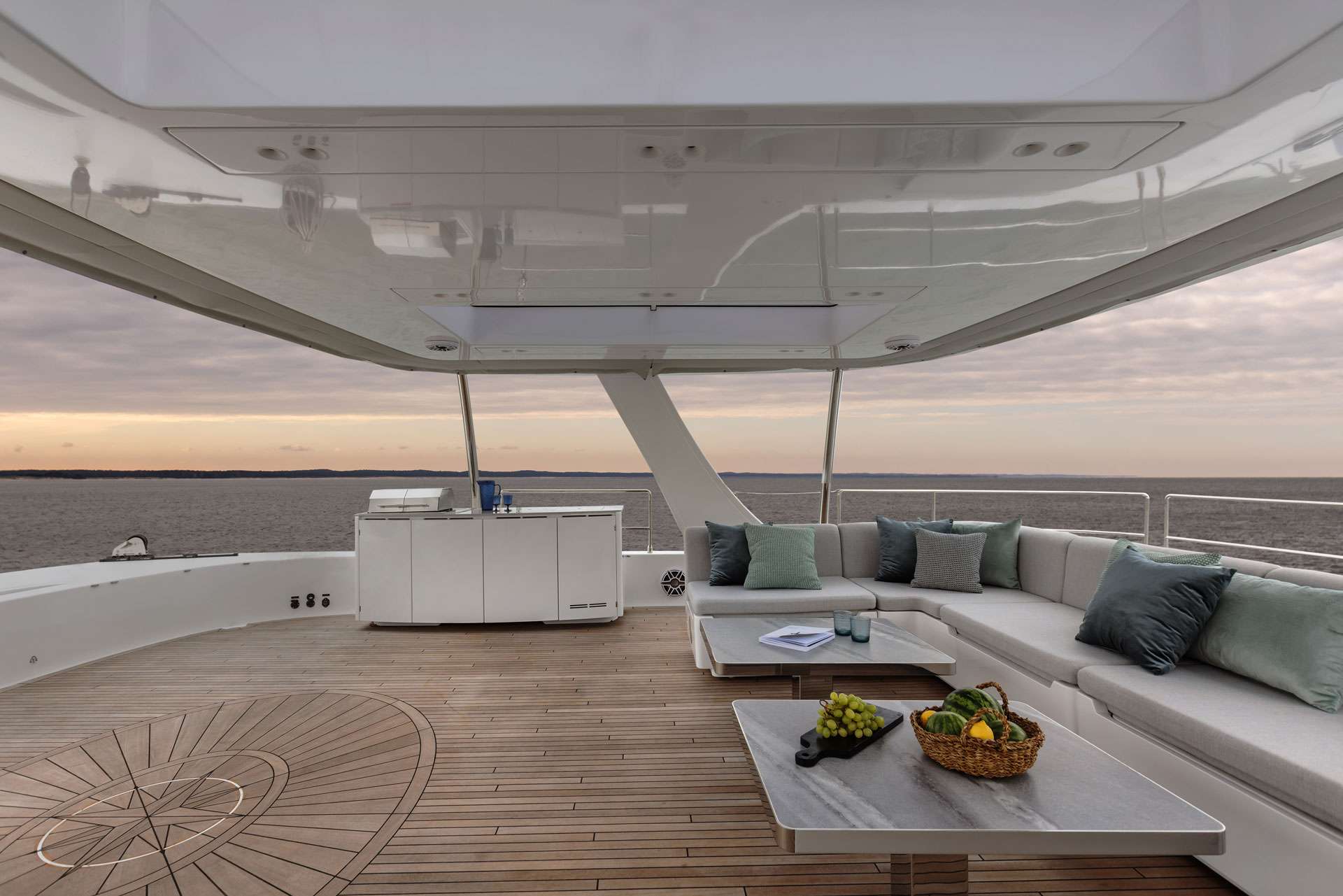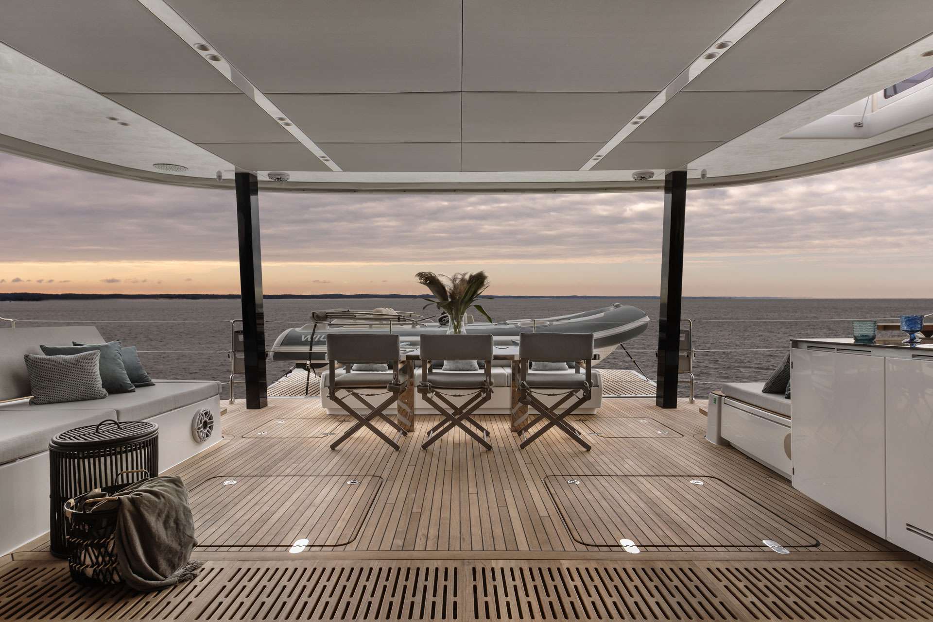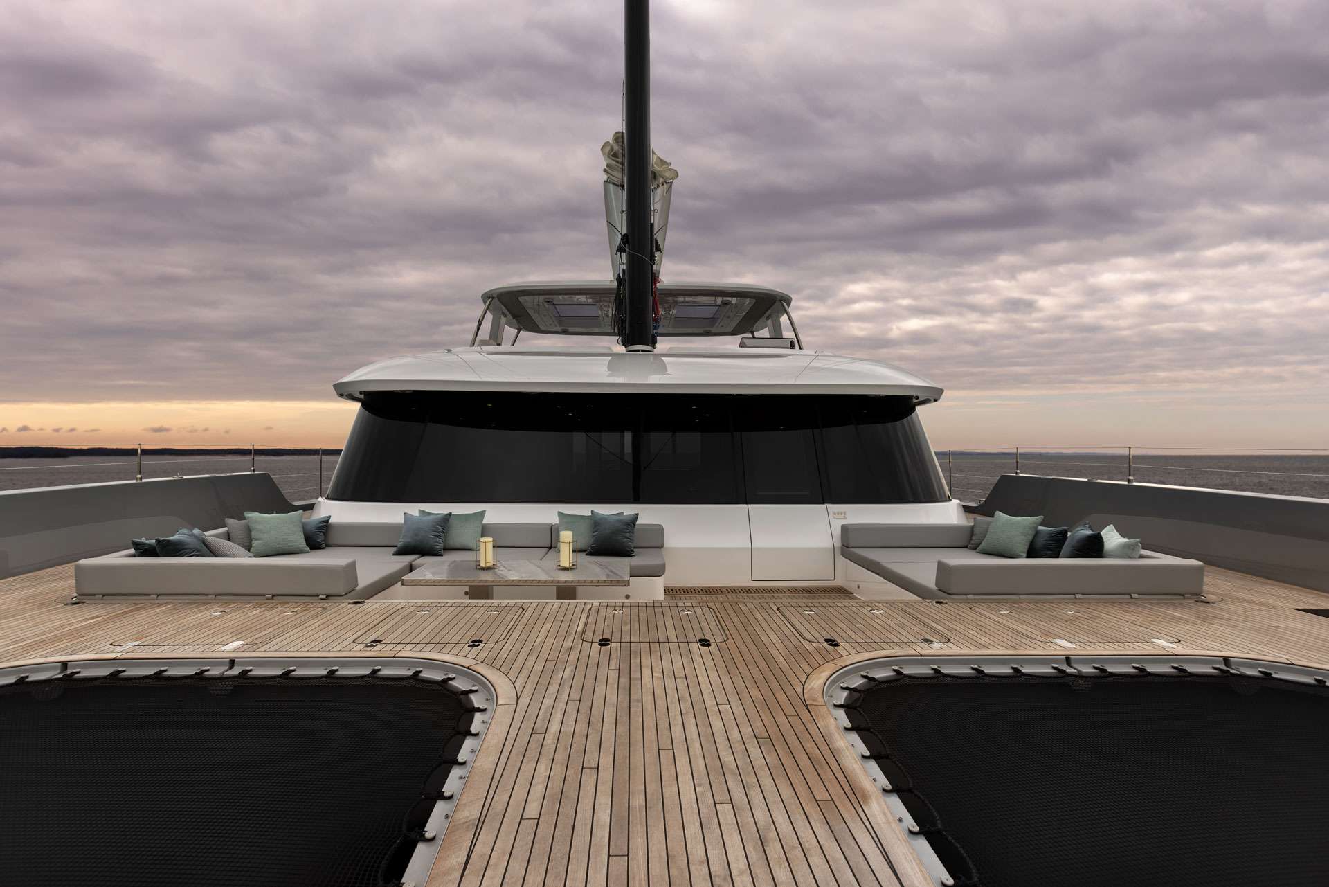 Guests can enjoy generous outdoor areas on both the forward deck and flybridge. The front trampolines are a favorite spot for relaxing near the water, while the flybridge provides plenty of space for lounging or hosting.