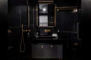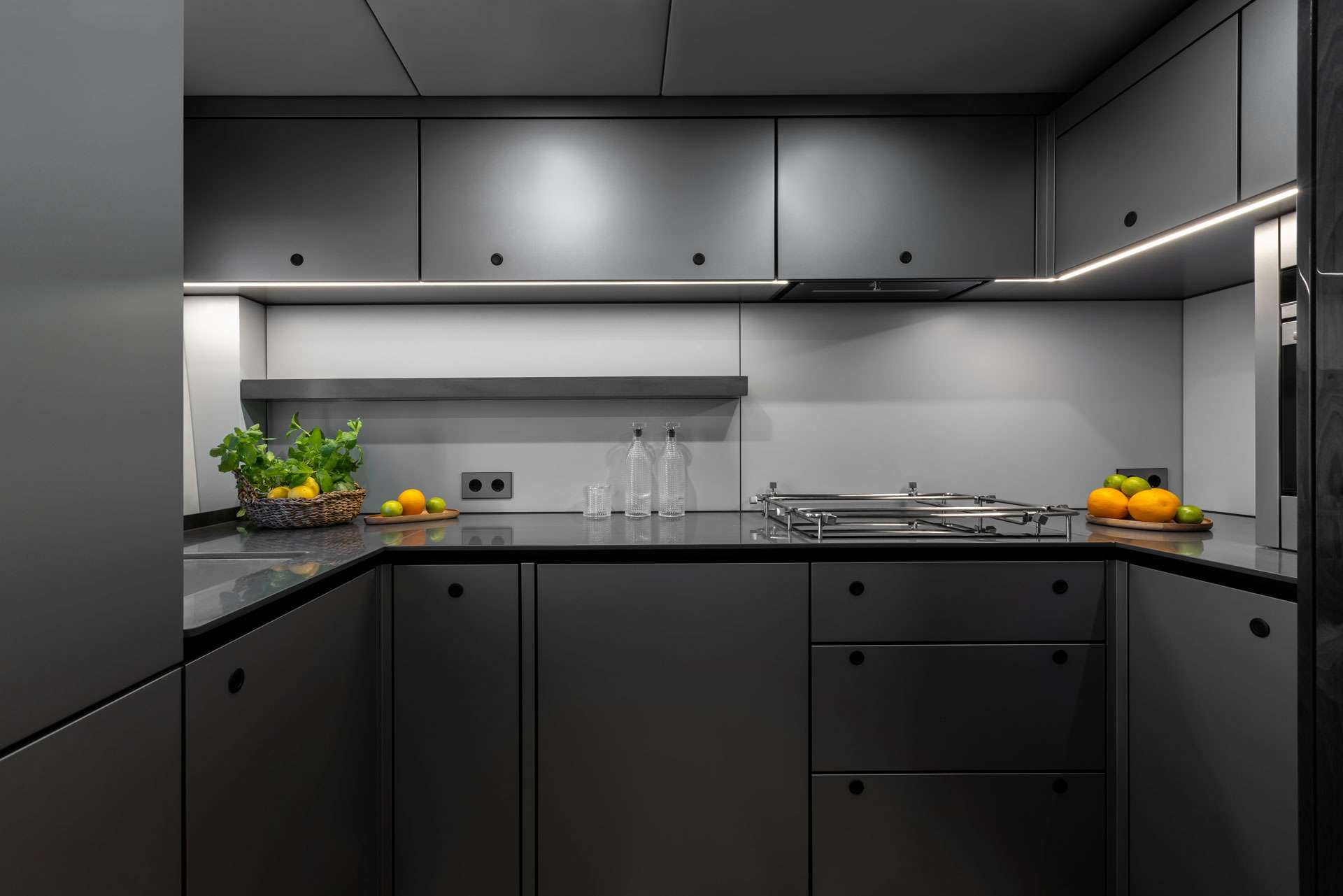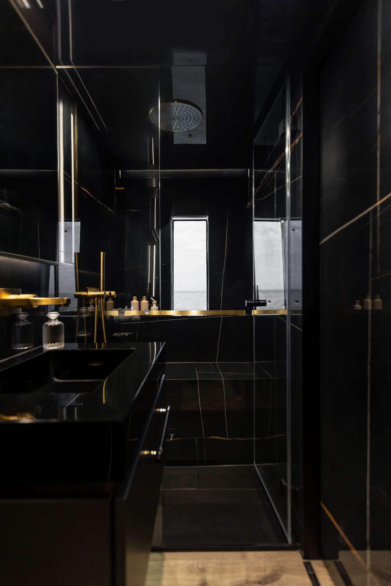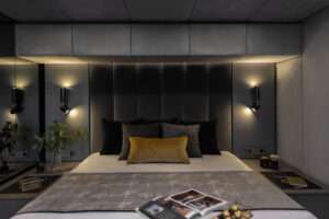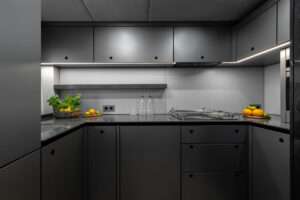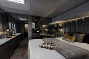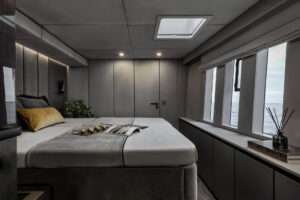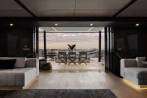The main salon features wide windows for panoramic views and opens directly onto the aft deck. Below, four en suite cabins accommodate up to eight guests comfortably, each designed with a contemporary look using dark stone and elegant touches.