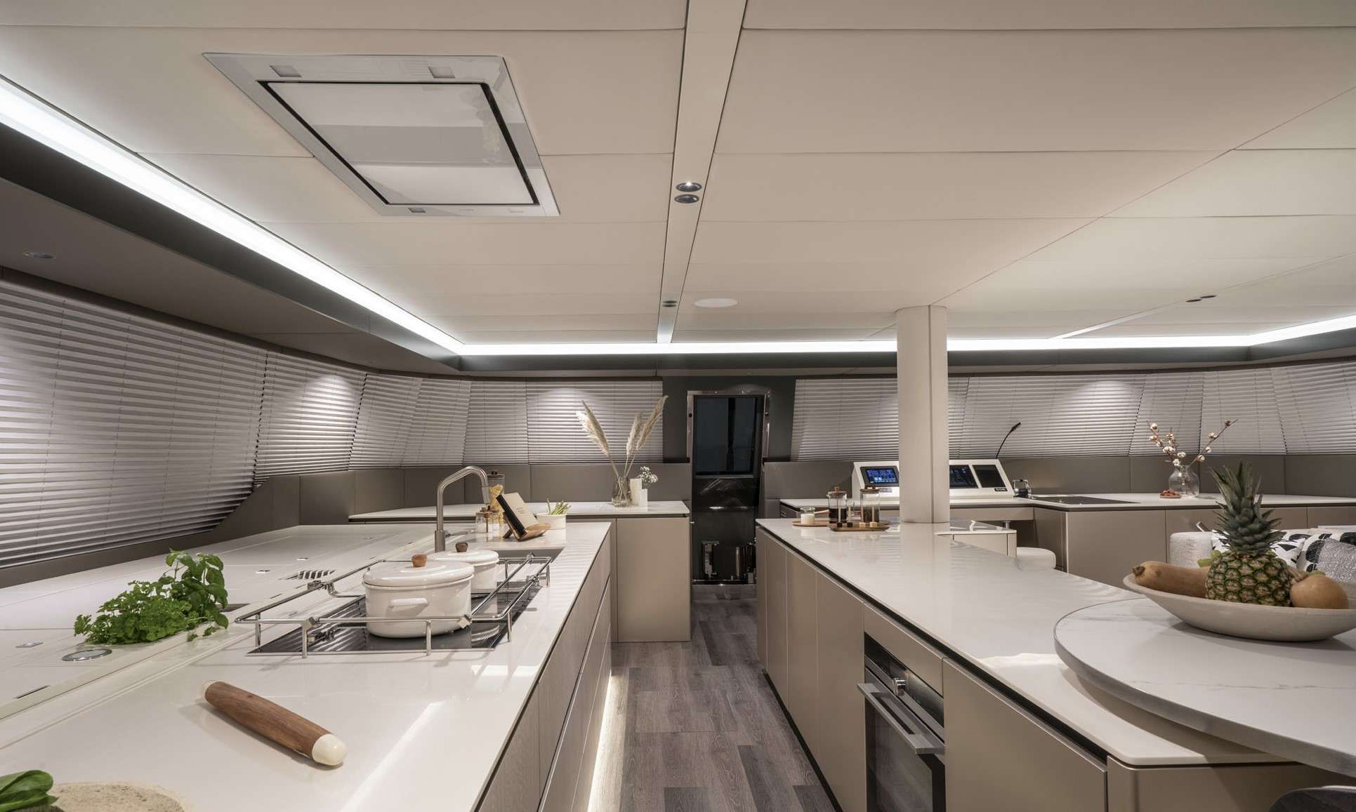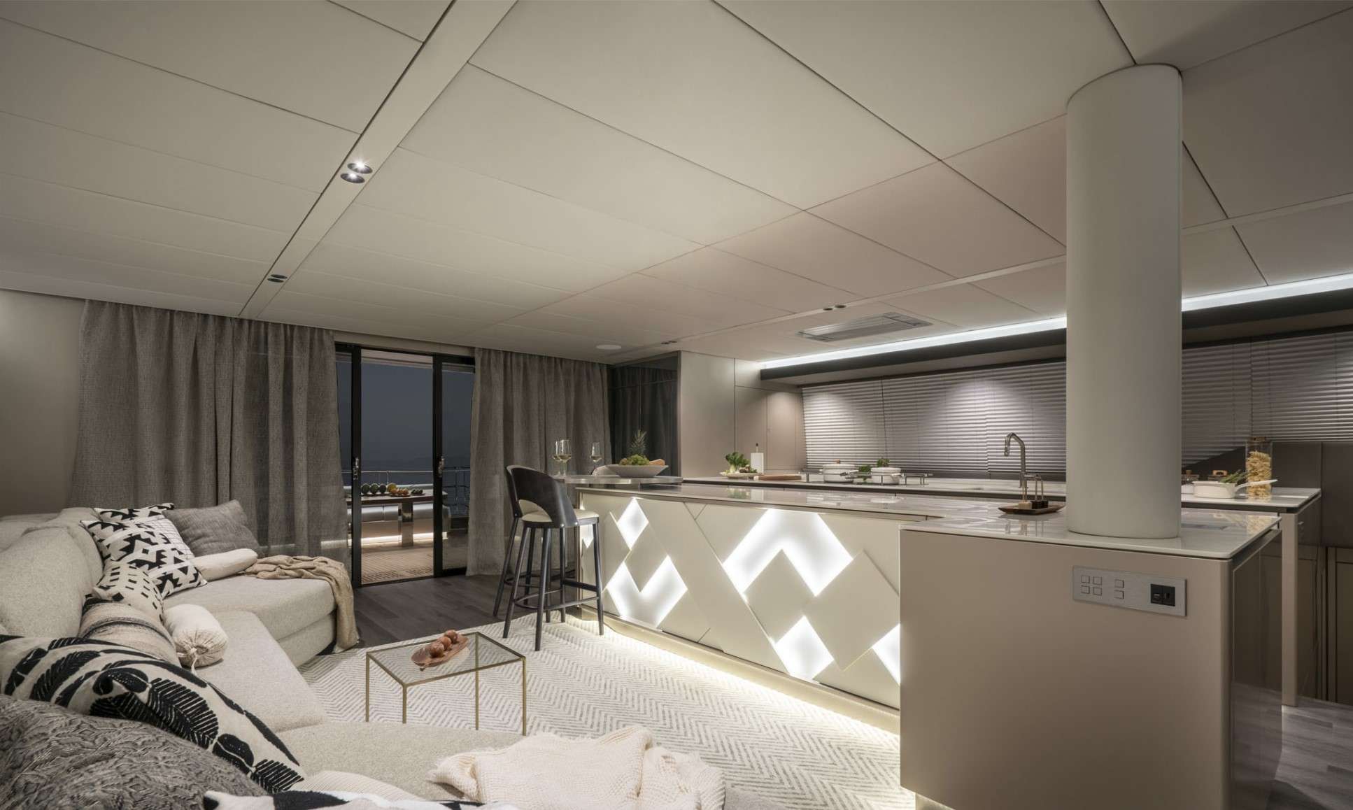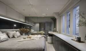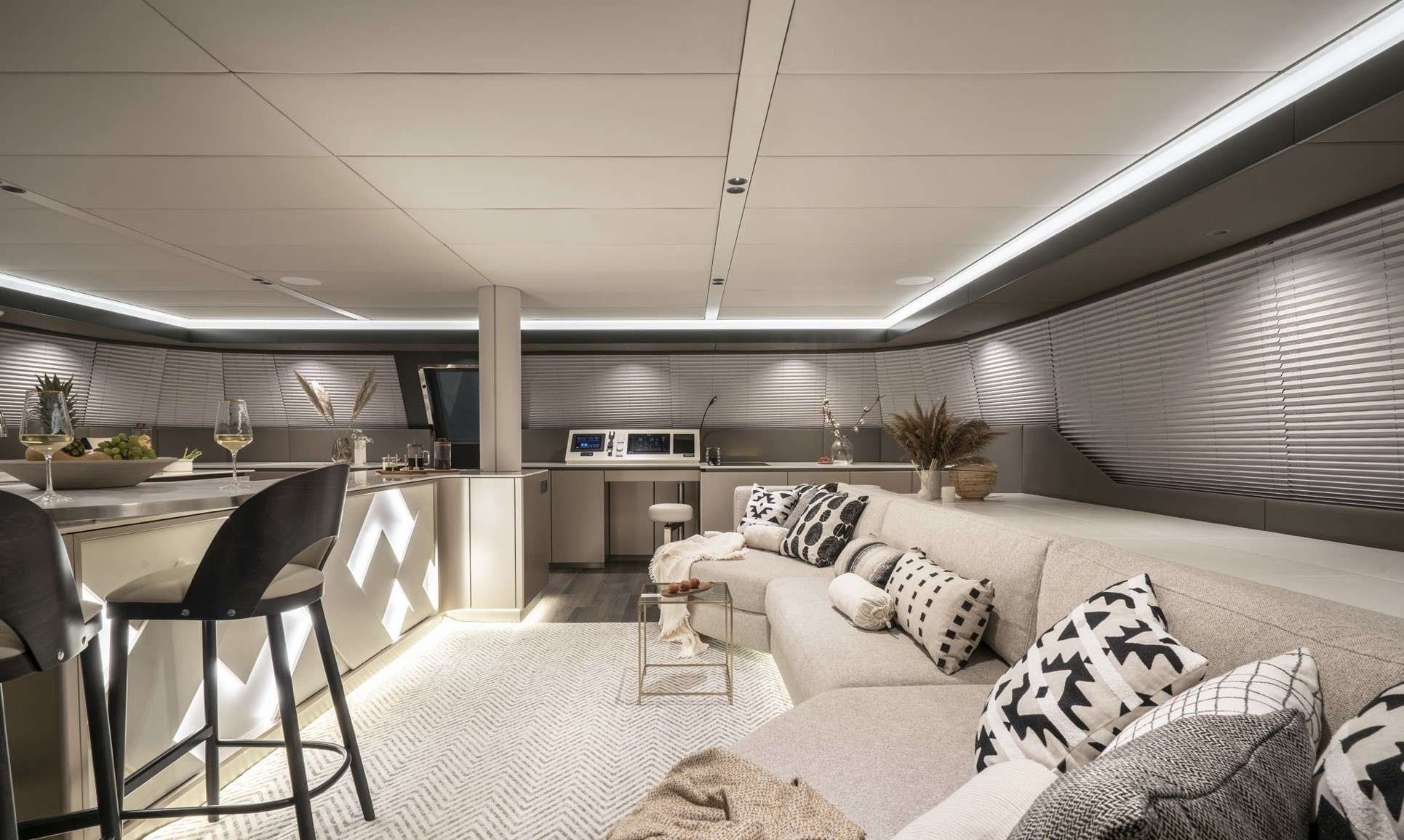 Outdoor highlights include a 50m² flybridge with bar and sunpads, a bow lounge, and an expansive aft cockpit with dining area and swim platform. Equipped with a wide array of water toys and cruising comfortably at 9 knots, YOLO is perfect for charters in both the Mediterranean and the Caribbean.